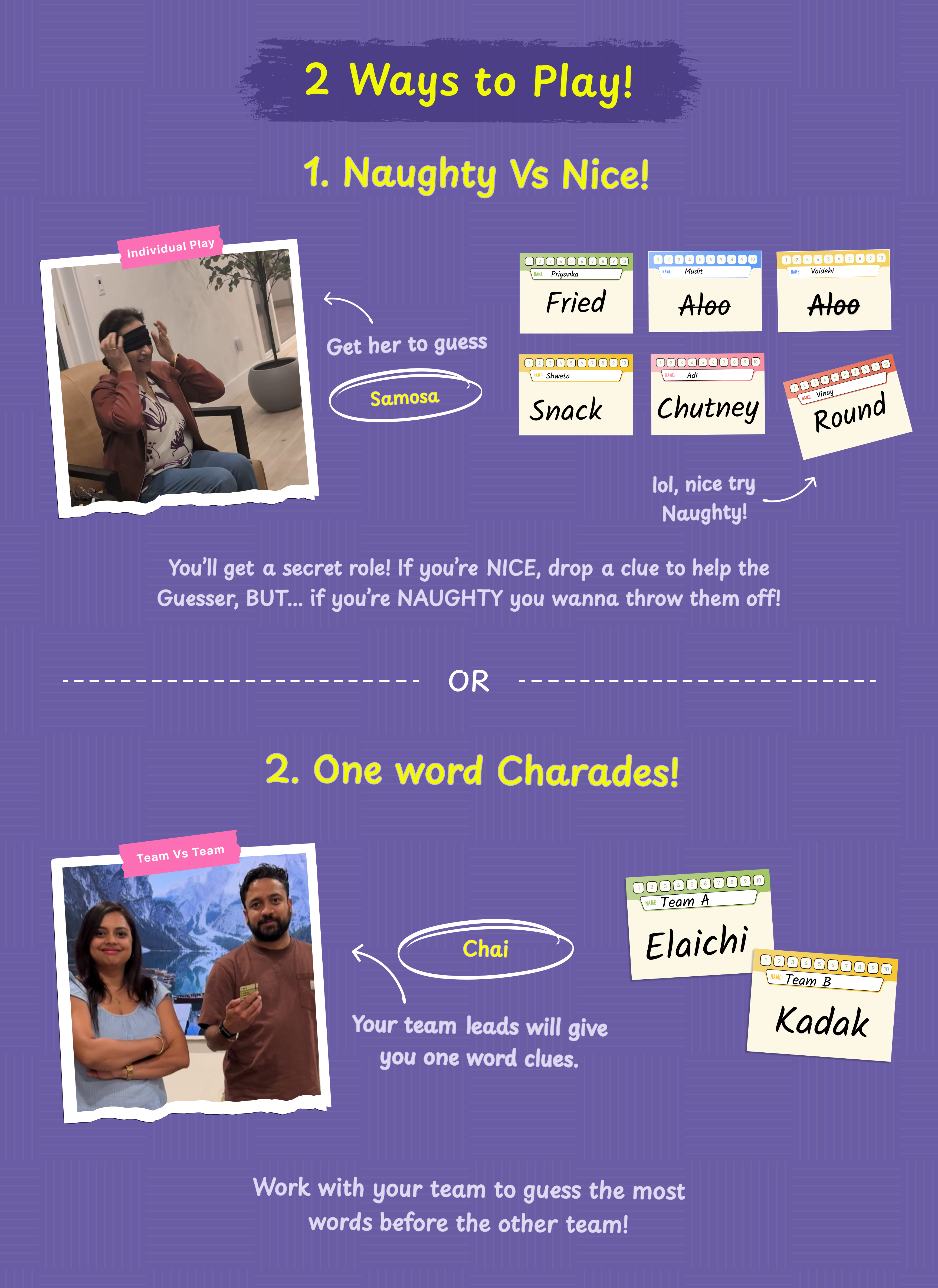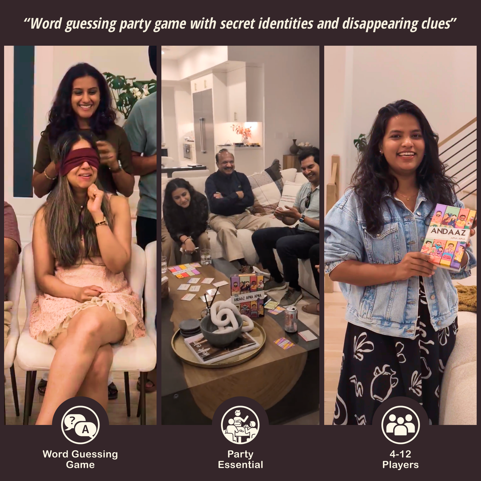 We played Andaaz at the next level board game cafe and fell in love with it, bought it immediately after the event. I loved the naughty vs nice mode , whereas my partner loved the reverse charades one. The game is sooo well done, highly recommend it.