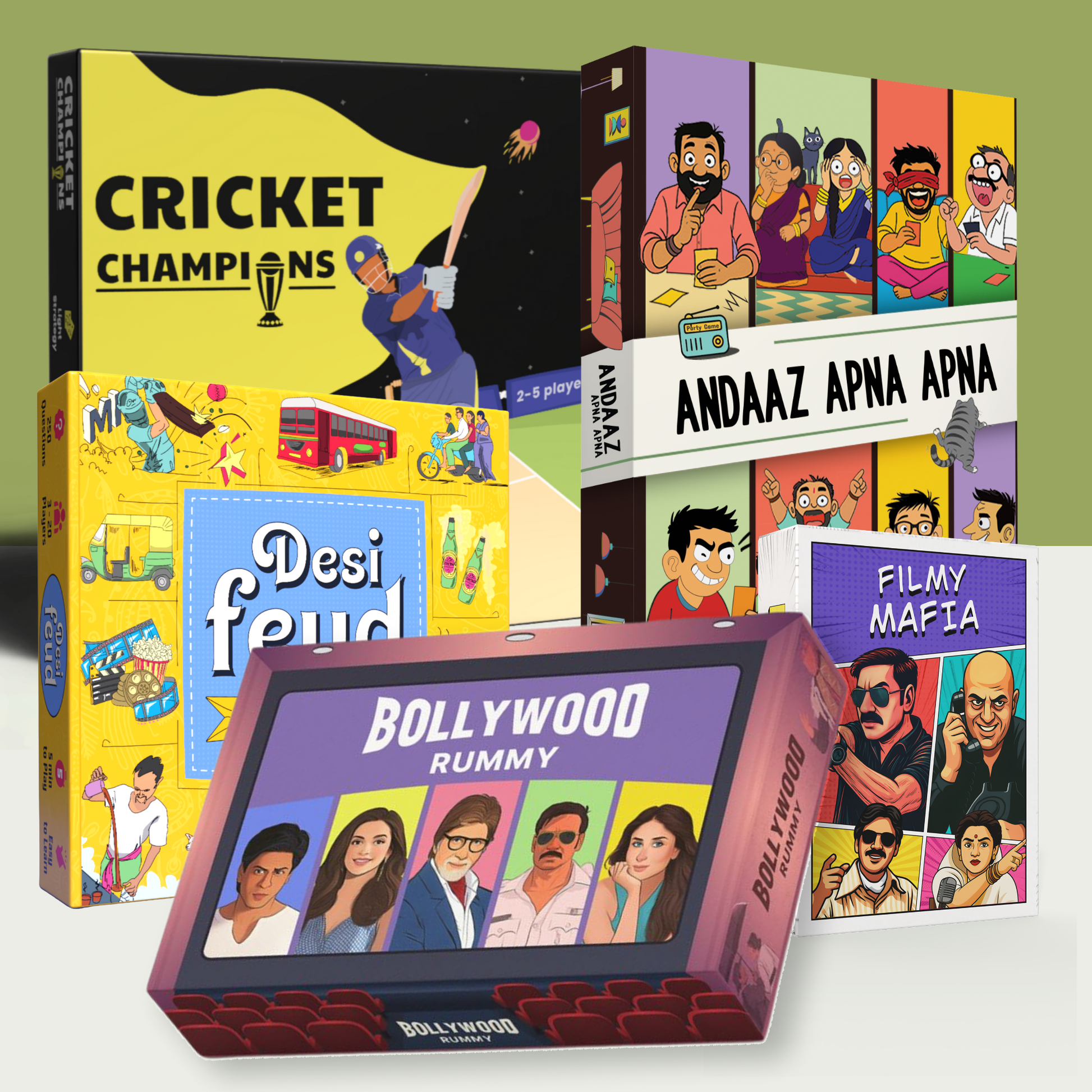 This all-in-one pack brings together all 5 of our bestselling Desi Board Games — from filmi madness to laugh-out-loud guessing, family drama to strategy showdowns.